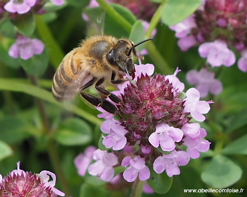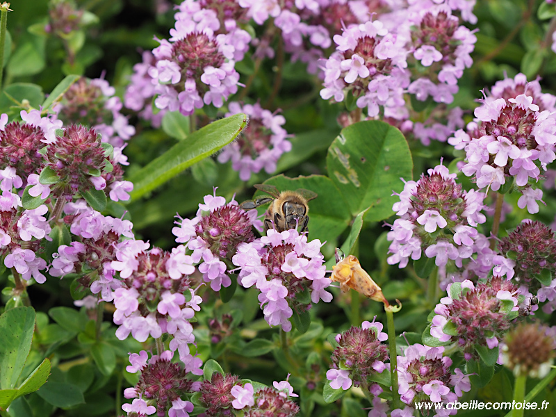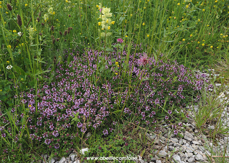 Thymus praecox. Le thym couché ou thym précoce. Plante ne dépassant pas 12 cm de hauteur. Elle se plaît sur tous types de sols, secs, ensoleillés et fleurit de juin à août. Comme toutes les variétés de thym, elle est très appréciée des abeilles.