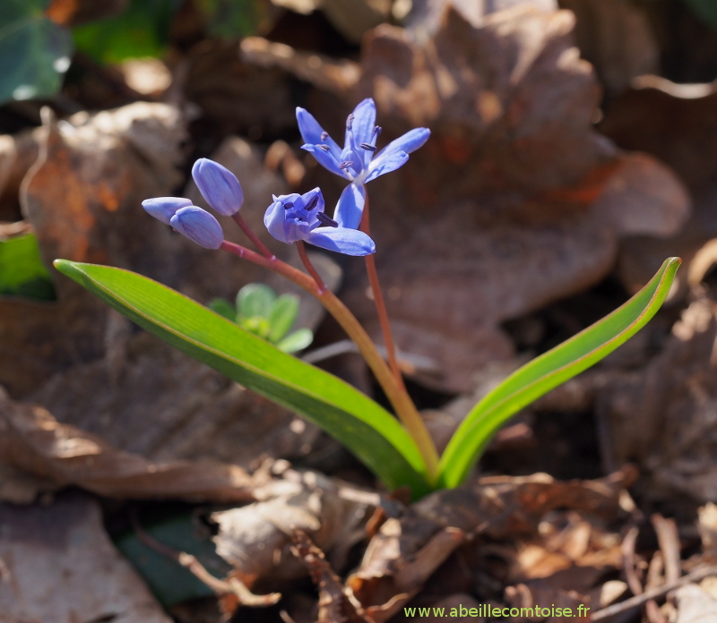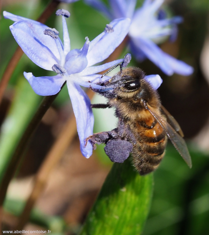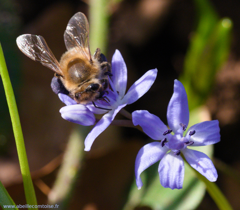 Scillia bifolia. Quelques abeilles ramènent du pollen bleu foncé à la ruche ? Certainement du pollen de scille à deux feuilles. Très abondantes en forêt à la sortie de l'hiver. Une autre variété similaire est la scille de Sibérie, qui agrémente les jardins.