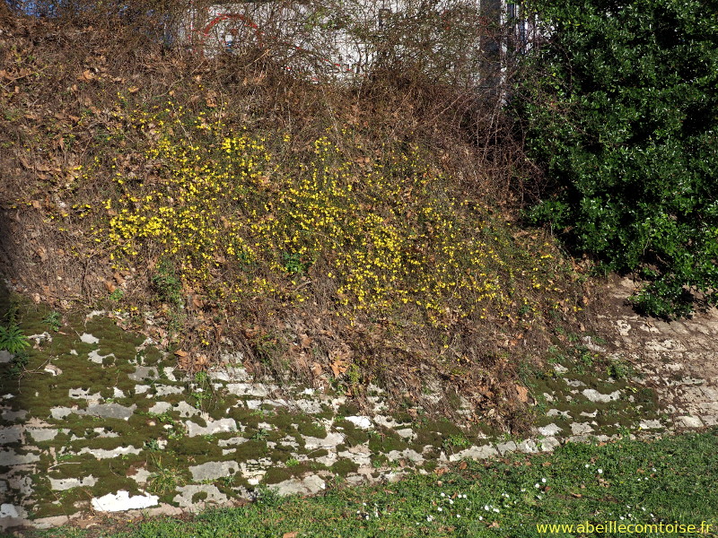 Jasminum nudiflorum. Ou jasmin à fleurs nues, parce que les fleurs arrivent avant les feuilles. Floraison de décembre à avril. Le 7 janvier, quelques abeilles mellifères butinent la plante.