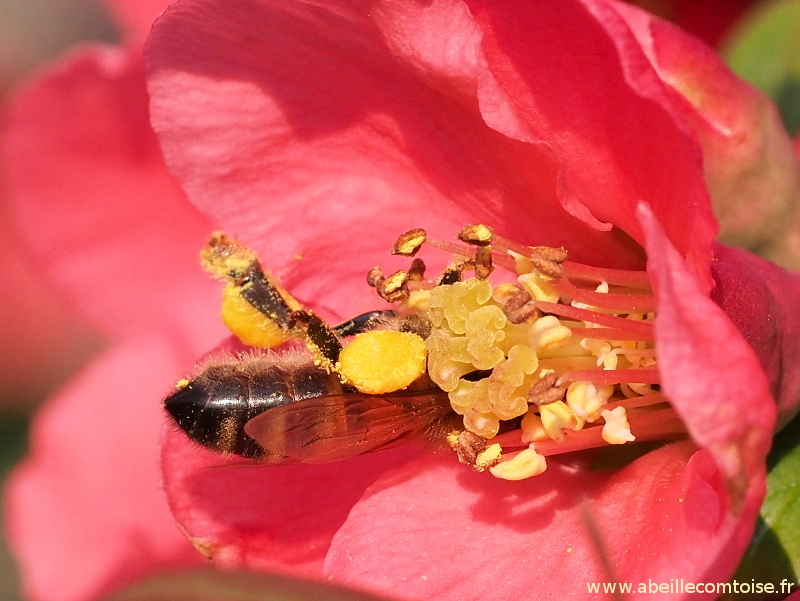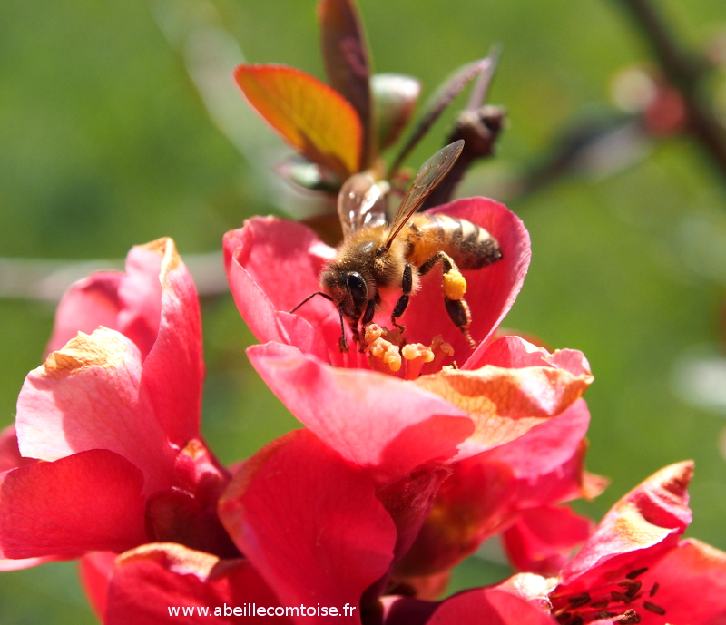 Chaenomeles japonica. Sa floraison qui peut débuter à la mi-mars intéresse les abeilles qui y récoltent nectar et pollen. C'est une plante ornementale que l'on rencontre fréquemment dans les propriétés.